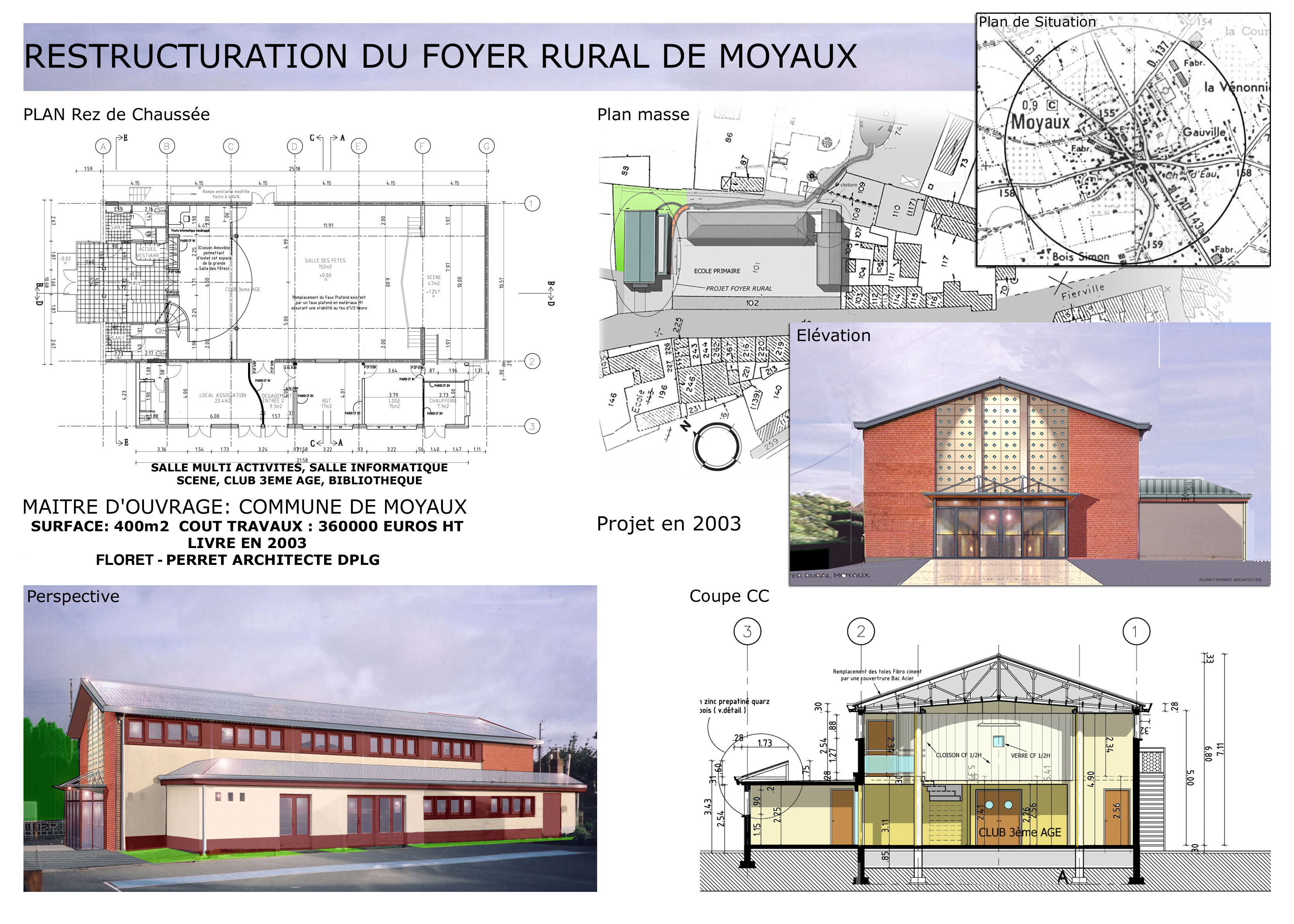 Maîtrise d'Ouvrage : Commune de Moyaux Type de mission : mission complète Projet livré en 2006 Surface : 350m² Montant des travaux : 350 000€ HT Caractéristiques : restructuration, réhabilitation et extension d'une salle des fêtes existante, salle de spectacle, médiathèque