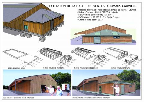 Maître d’ouvrage : ASSOCIATION EMMAUS LE HAVRE-CAUVILLE Type de mission : Mission complète Chantier livré début 2013 – Durée : 5 mois Surface créée : 150 m² Coût travaux : 80 000€ HT Caractéristiques : Extension halle des ventes existante, murs ossature bois, couverture bac acier