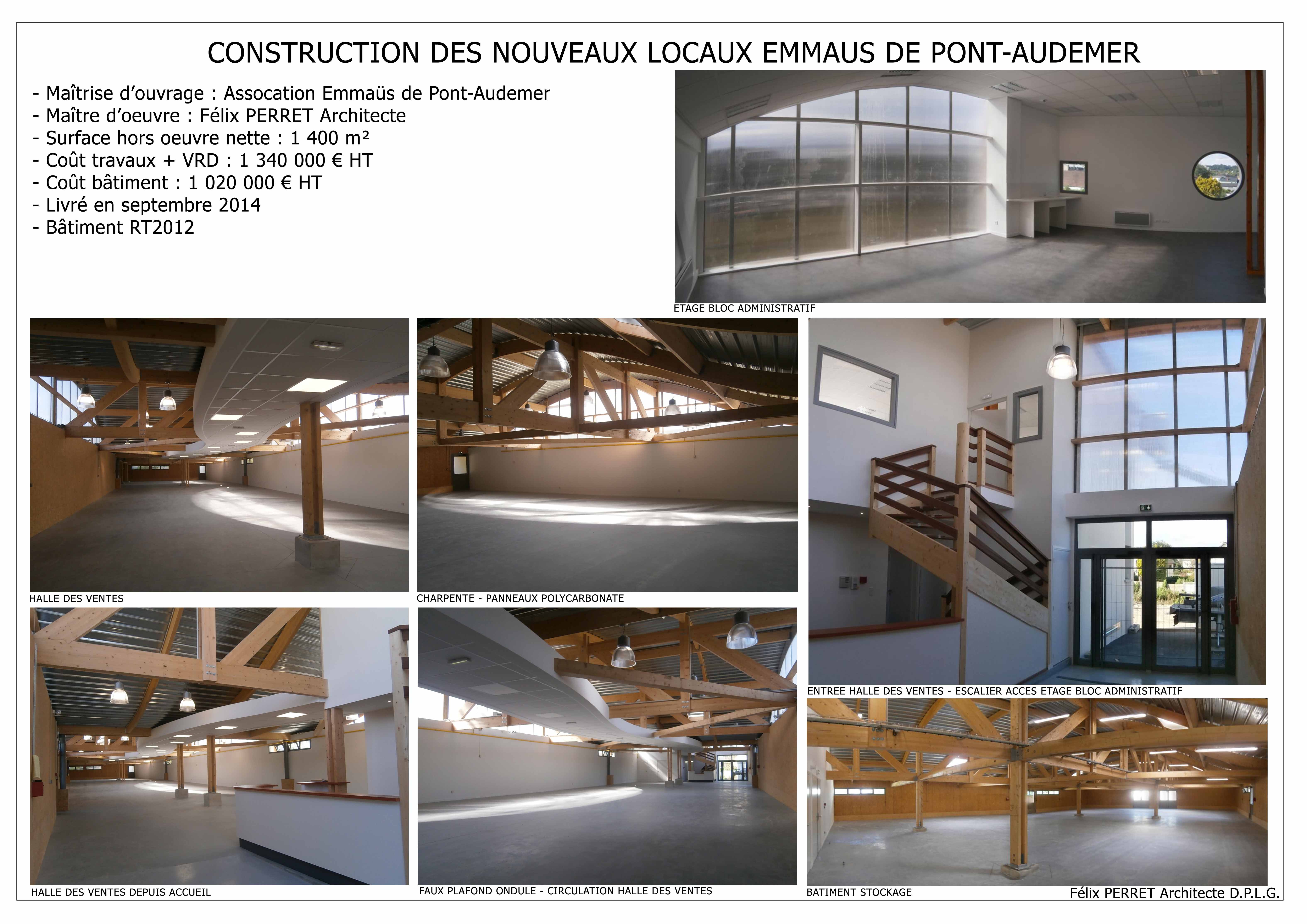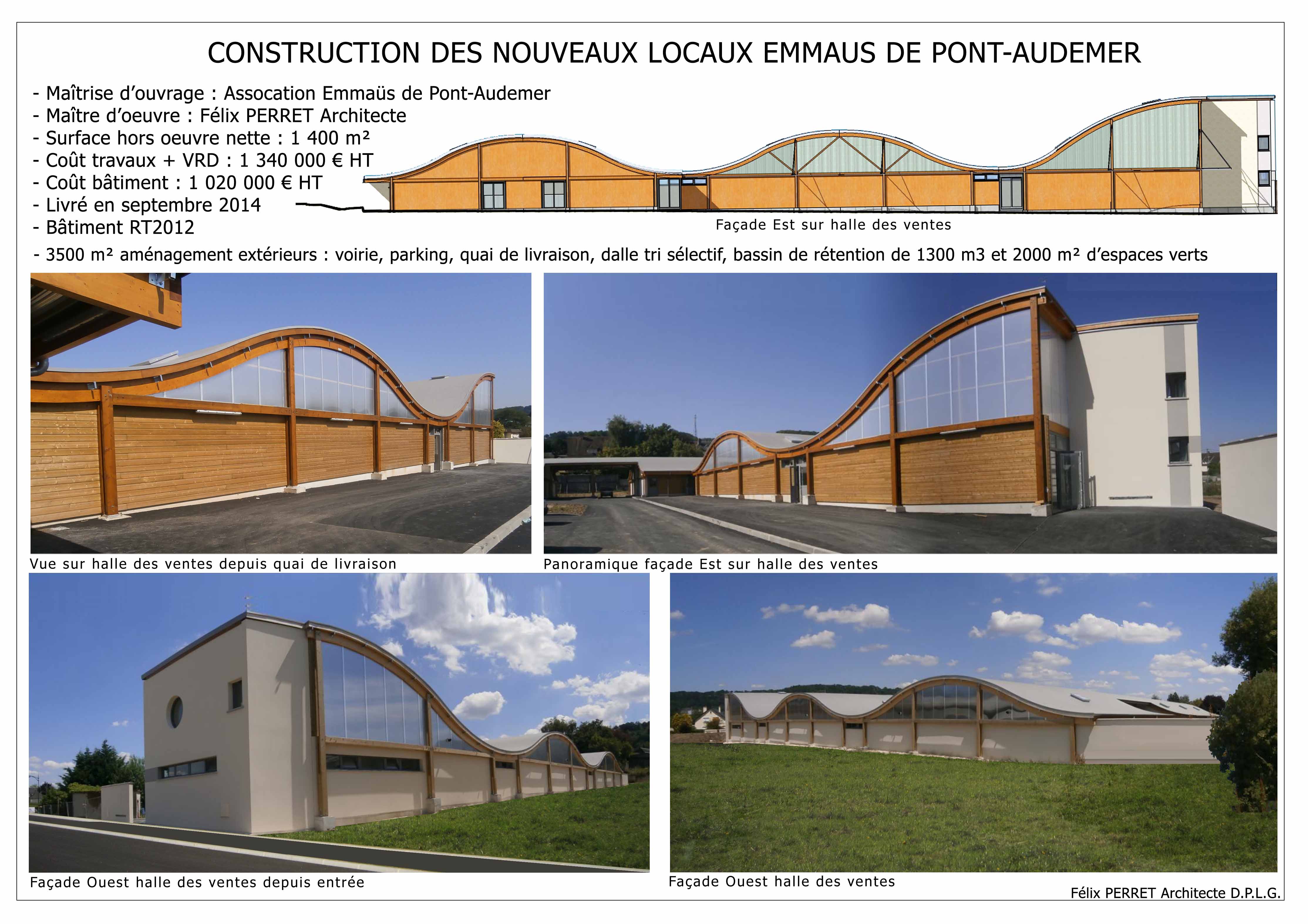 Maître d’ouvrage : ASSOCIATION EMMAUS PONT-AUDEMER Type de mission : Mission complète Chantier livré en septembre 2014 - Durée : 15 mois Surface : 1700 m² Coût travaux + VRD : 1 340 000€ HT Coût bâtiment : 1 020 000€ HT Caractéristiques : Bâtiment neuf 1700m², ossature bois, complexe toiture bac acier, RT2012, aménagements extérieurs 3500m² : bassin rétention 1300m3, voirie, parking, quai livraison, espaces verts
