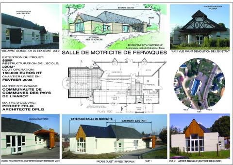 Maitrise d' Ouvrage : Cdc Livarot Type de mission : mission complète Chantier livré en février 2008 Surface d'extension du projet : 80m² Surface de restructuration de l'école : 220m² Coût travaux : 140 000€ HT Caractéristiques : restructuration existant, extension neuve et construction d'un préau