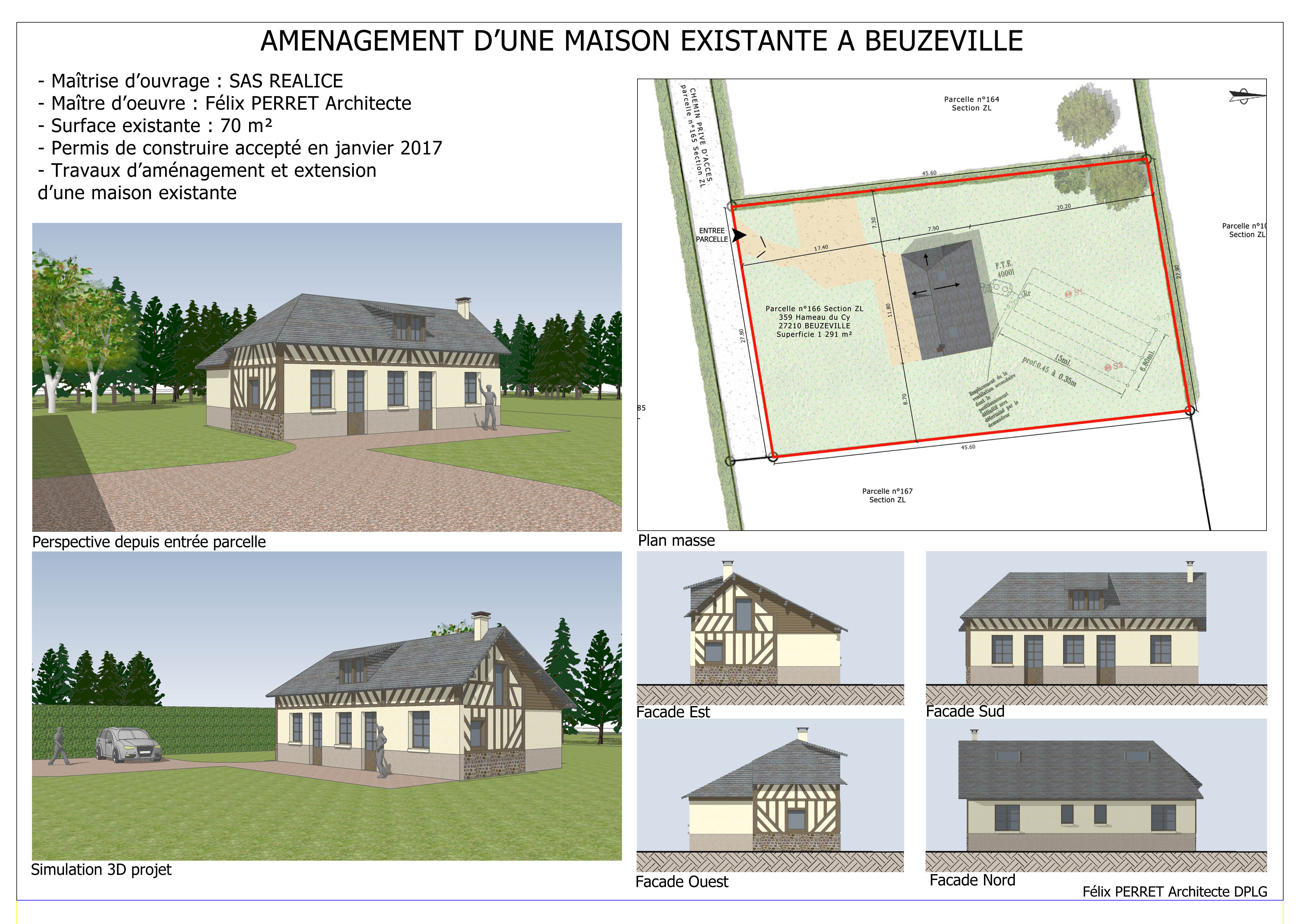 Maître d'ouvrage : SAS RéaliceType de mission : permis de construirePermis de construire accepté en janvier 2017Surface : 70m²Caractéristiques : travaux d'aménagement et d'extension d'une maison existante.