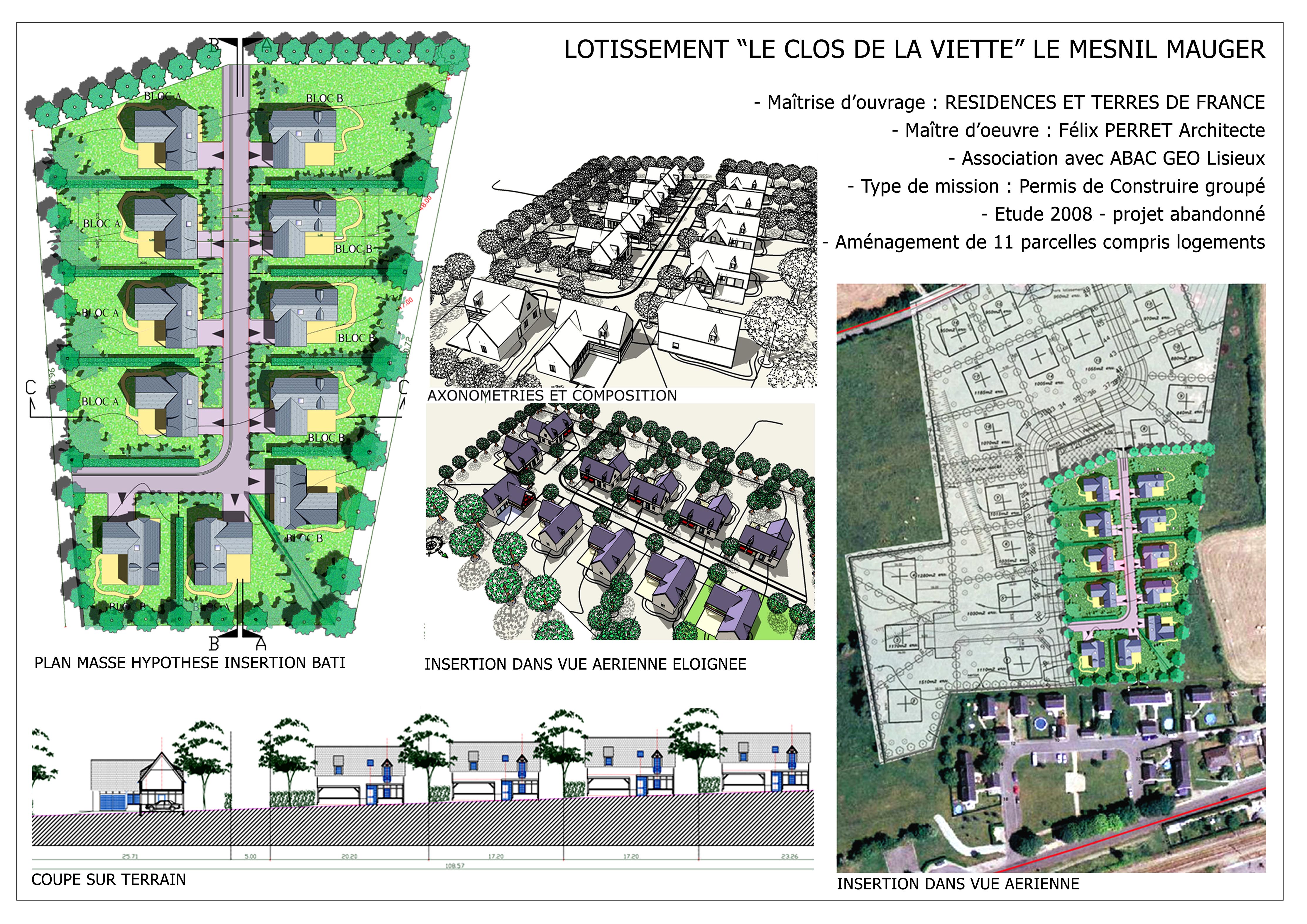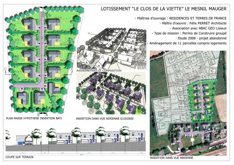 Création et réalisation d'un lotissement "Le Clos de la Viette" Le Mesnil Mauger Maître d'ouvrage : Résidences et Terres de France Type de mission : permis de constuire groupé Etude 2008 - Projet abandonné Caractéristiques : Création d'un lotissement de 11 parcelles + construction 11 logements