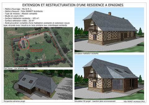 Maître d’ouvrage : Me & M. L._Type de mission : Mission complète_Etude en cours 2021_Surface habitation existante : 105 m²_Surface extension créée : 20 m²_Caractéristiques : restructuration complète d’une habitation existante et extension neuve type véranda