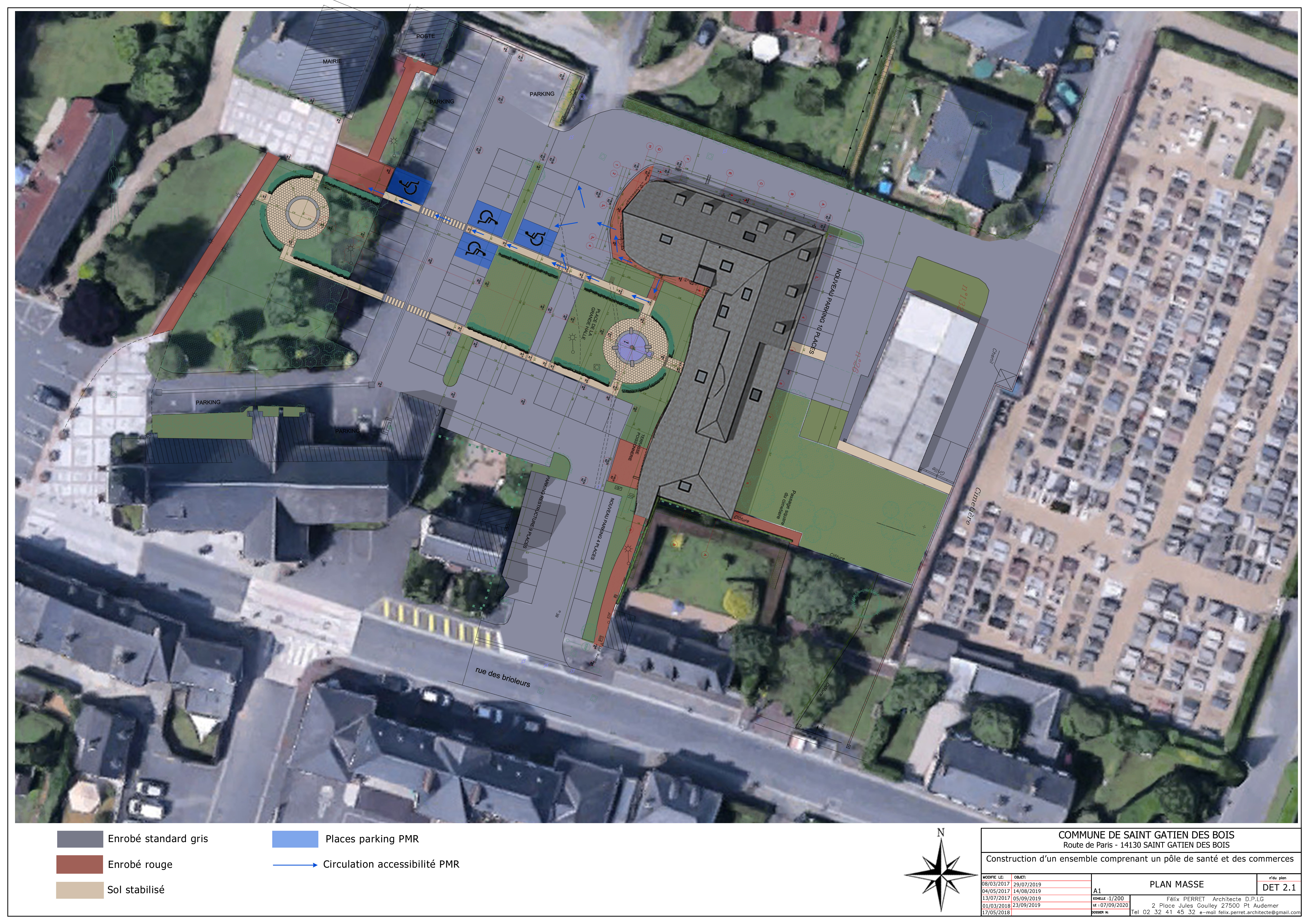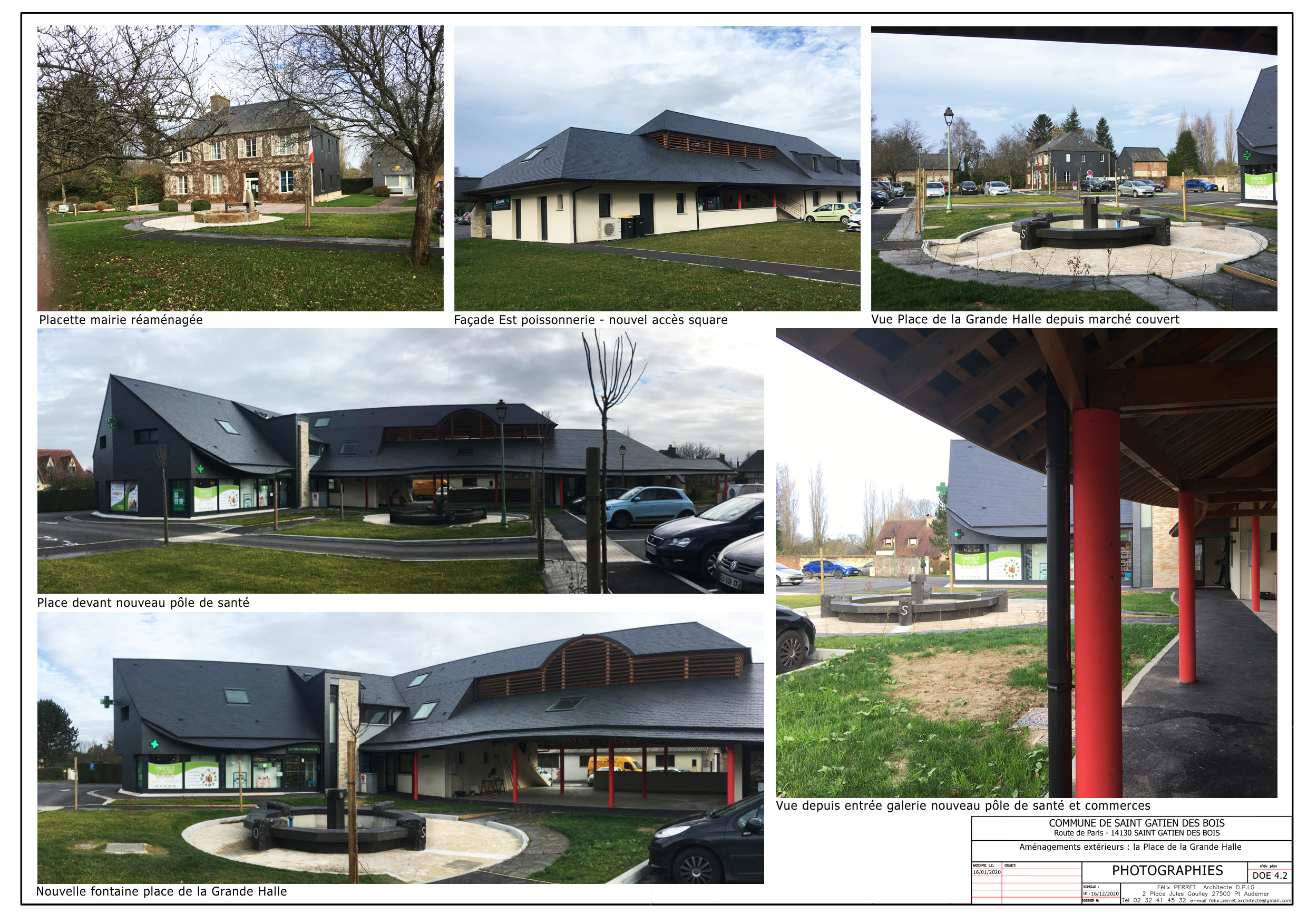 Maître d’ouvrage : Commune de SAINT GATIEN DES BOIS_Association avec ABAC GEO Lisieux_Type de mission : Conception et réalisation_Livré en novembre 2020_Caractéristiques : Suite à construction du nouveau pôle de santé (voir référence) aménagement de la place dite « Grande Halle » en liaison avec jardin mairie. Création d’une fontaine publique avec bassin en pierre, parking, aménagements paysagers, circulation piétonne…