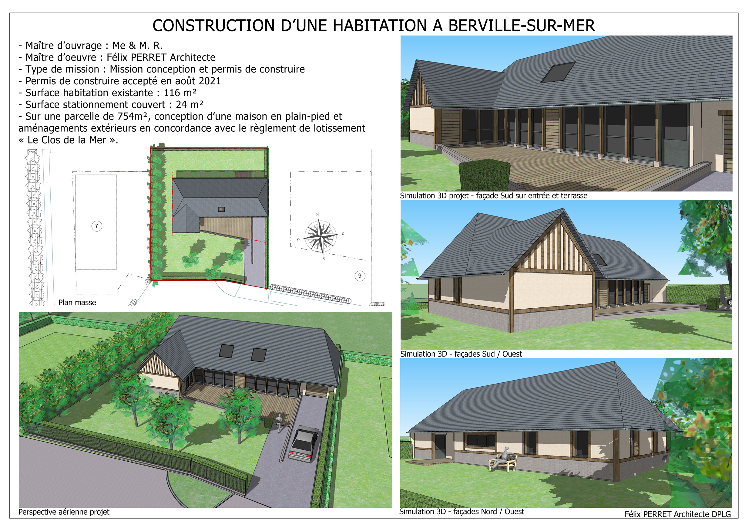 Maître d’ouvrage : M. & Me R.Type de mission : Mission conception et PCSurface de la plancher : 116 m²Surface du garage : 24m²Caractéristiques : Sur une parcelle de 754m², conception d’une maison en plain-pied et aménagements extérieurs en concordance avec le règlement de lotissement « Le Clos de la Mer ».