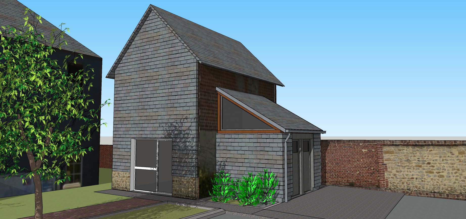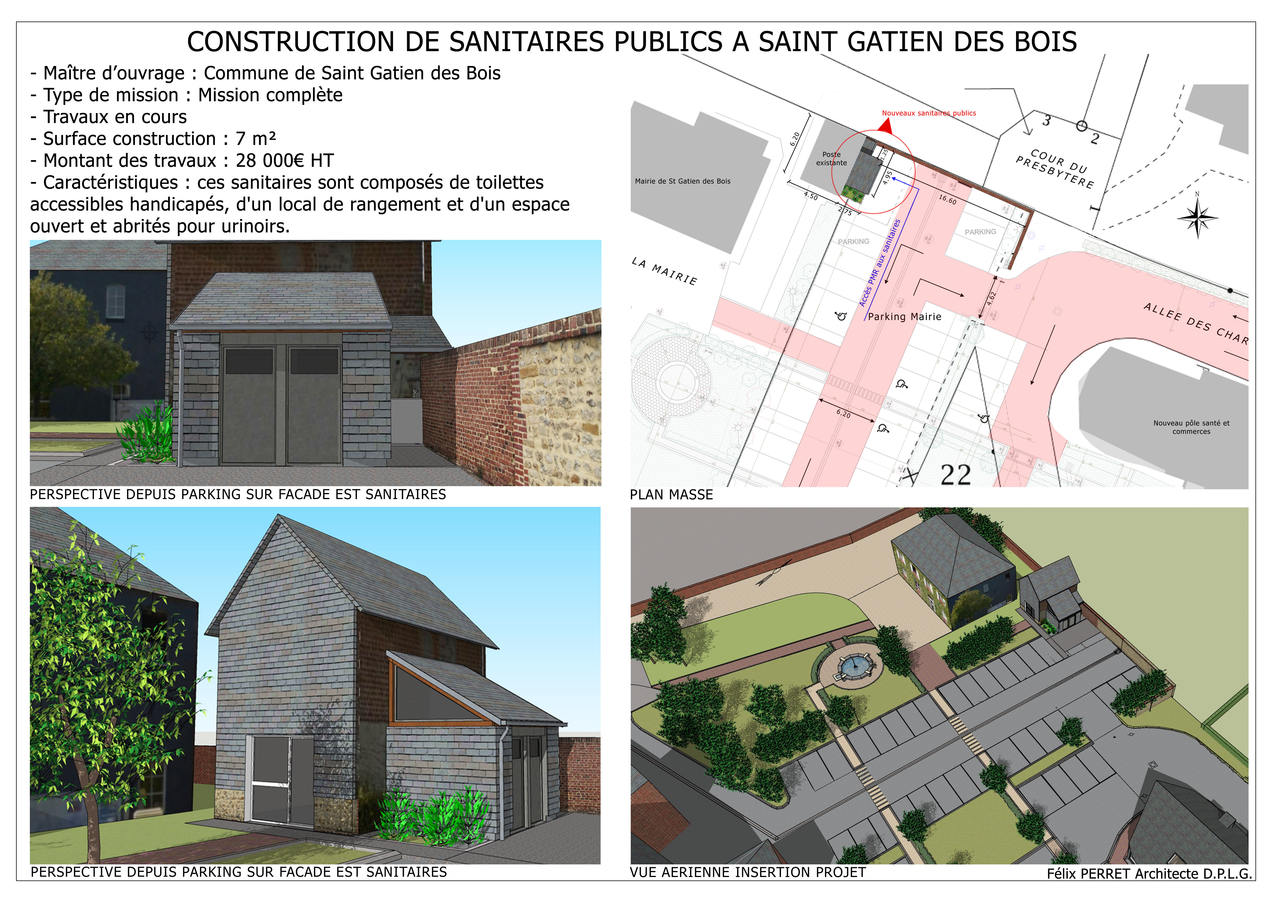 Maître d’ouvrage : Commune de Saint Gatien des Bois - Type de mission : Mission complète - Travaux en cours - Surface construction : 7 m² - Montant des travaux : 28 000 €HT - Caractéristiques : ces sanitaires sont composés de toilettes accessibles handicapés, d'un local de rangement et d'un espace ouvert et abrités pour urinoirs.
