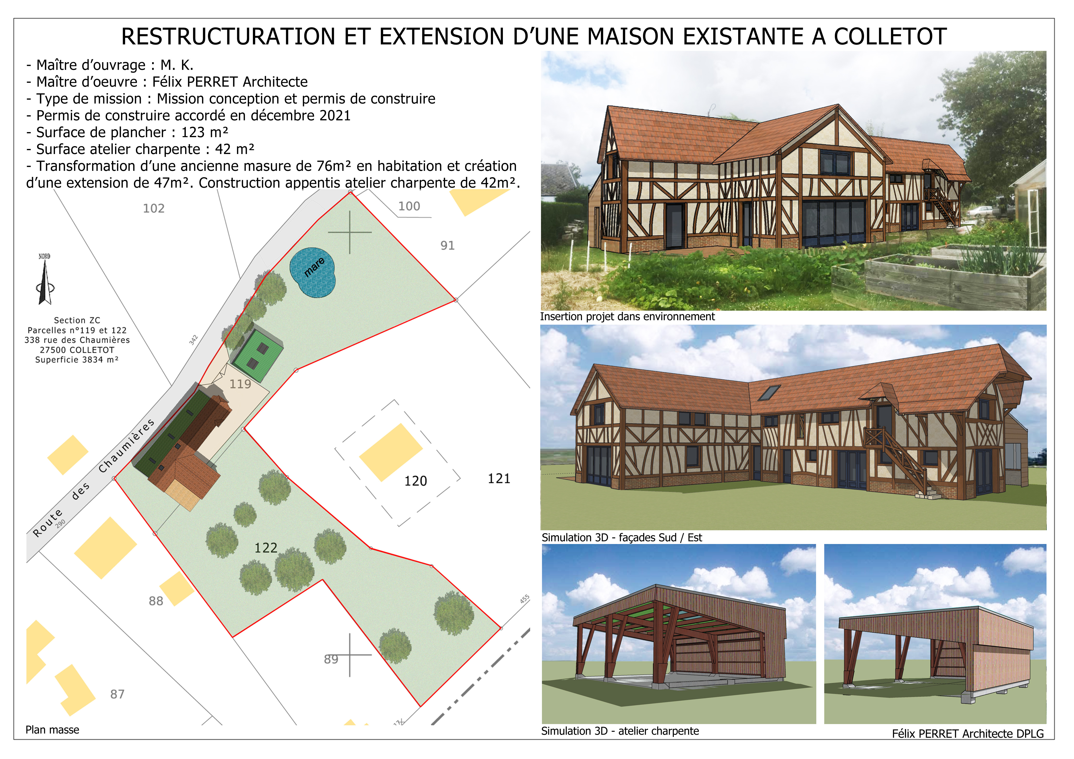 Maître d’ouvrage : M. K.Type de mission : Mission conception et PCPermis de construire accepté décembre 2021Surface de la plancher : 123 m²Surface du l’atelier charpente : 42m²Caractéristiques : Transformation d’une ancienne masure de 76m² en habitation et création d’une extension de 47m². Construction d’un appentis atelier charpente ouvert et couvert de 42m².