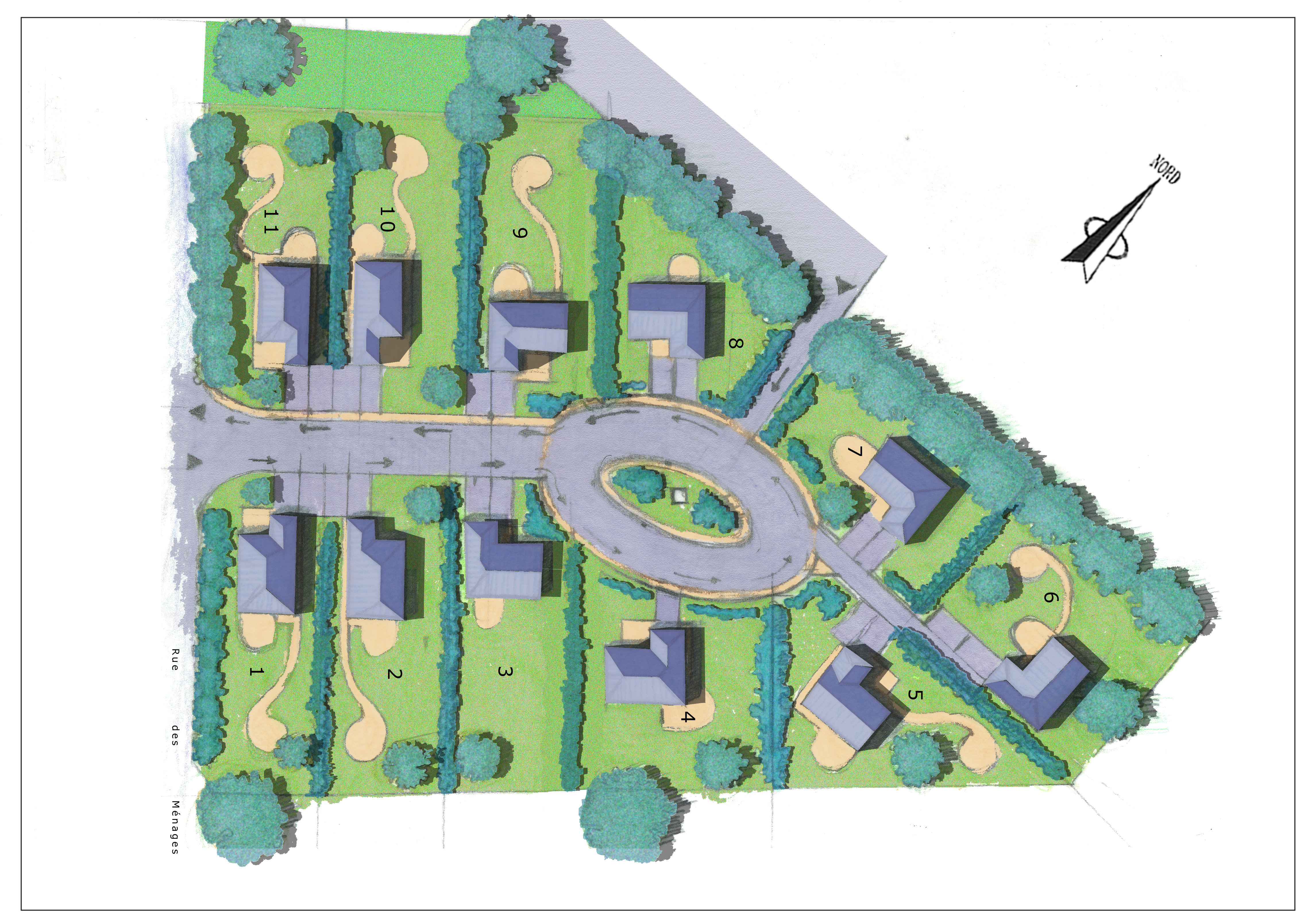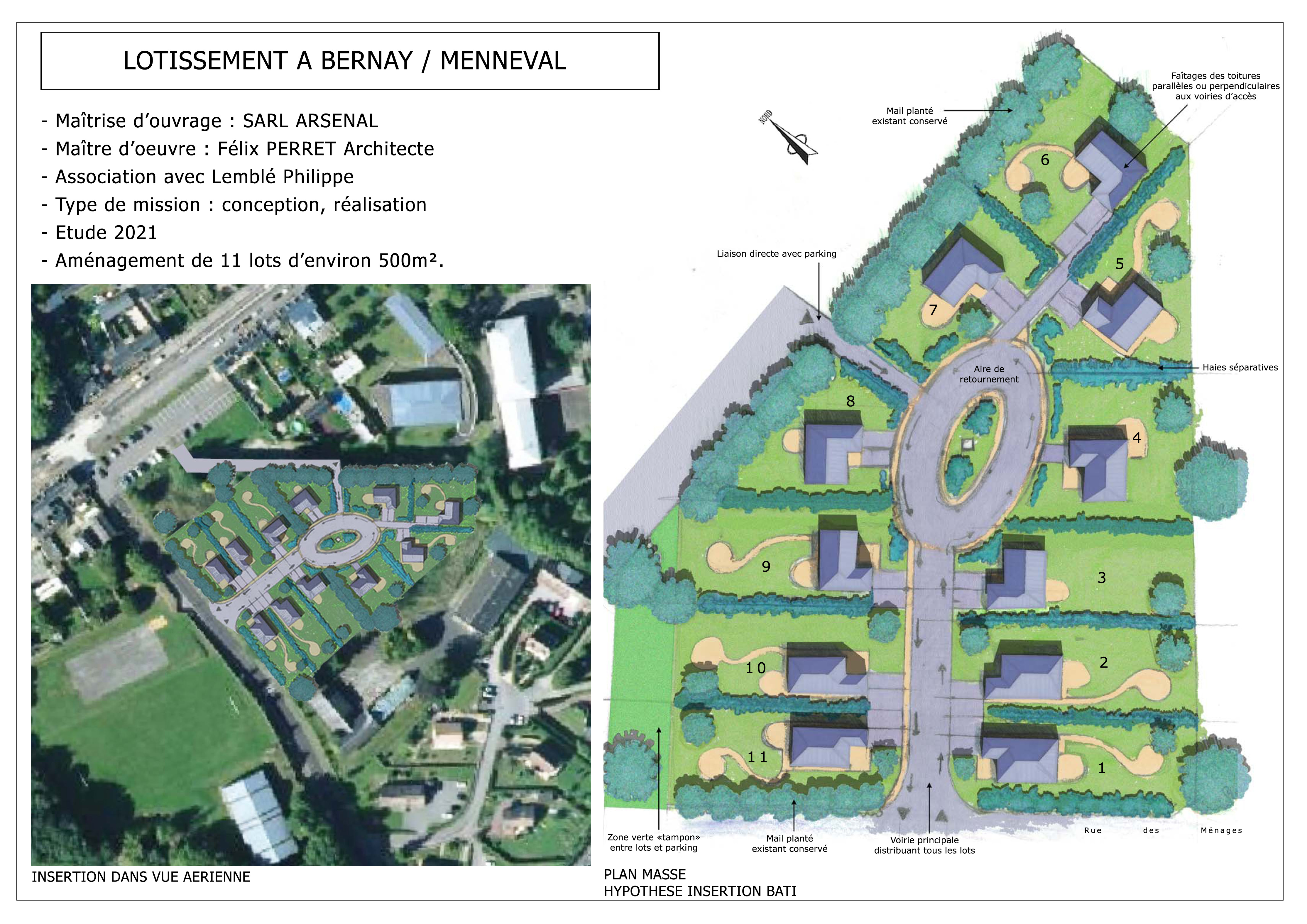 Maître d’ouvrage : SARL ARSENALAssociation avec Lemblé PhilippeType de mission : Conception, réalisationEtude en cours 2021Caractéristiques : Aménagement de 11 parcelles d'environ 500m²