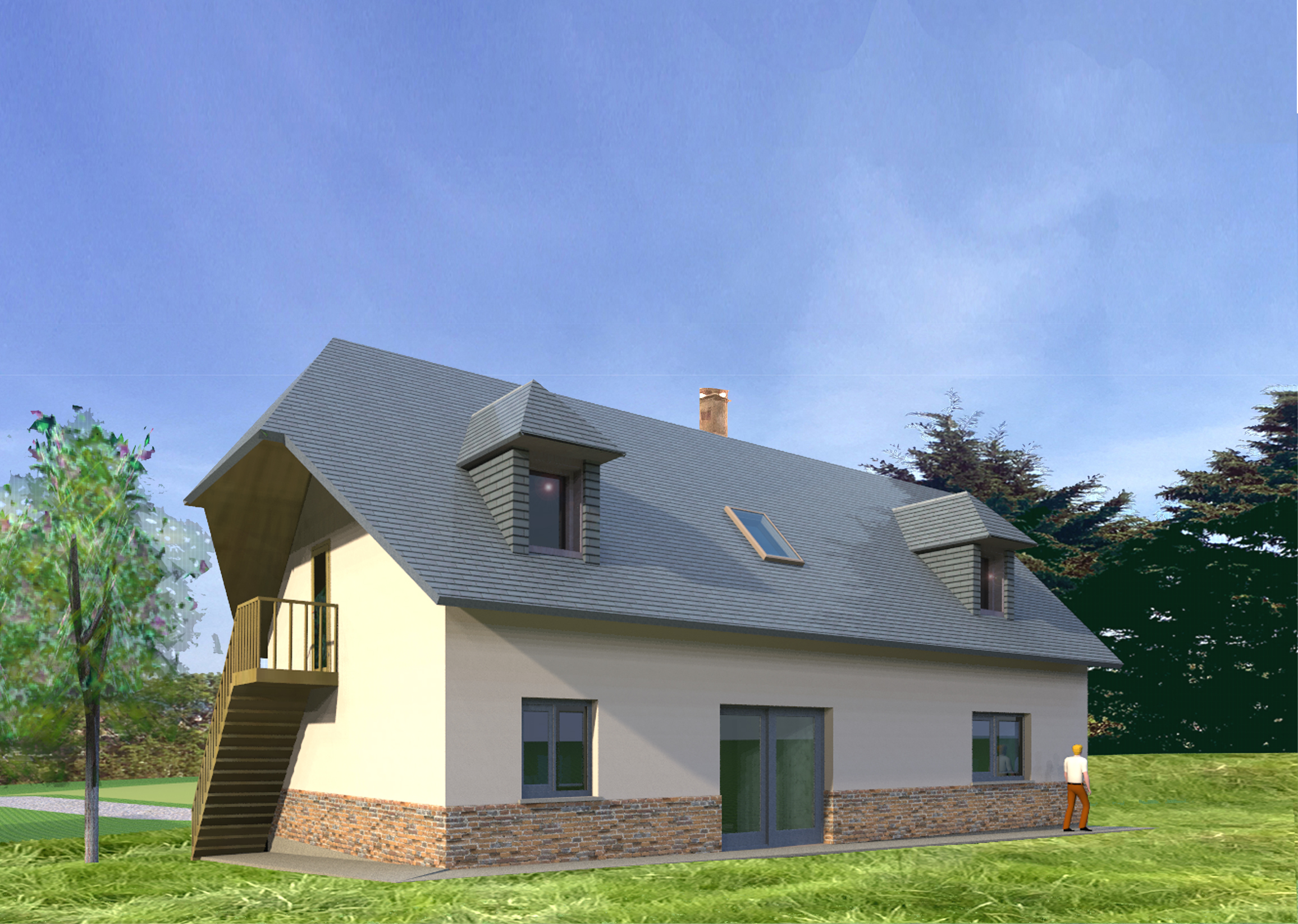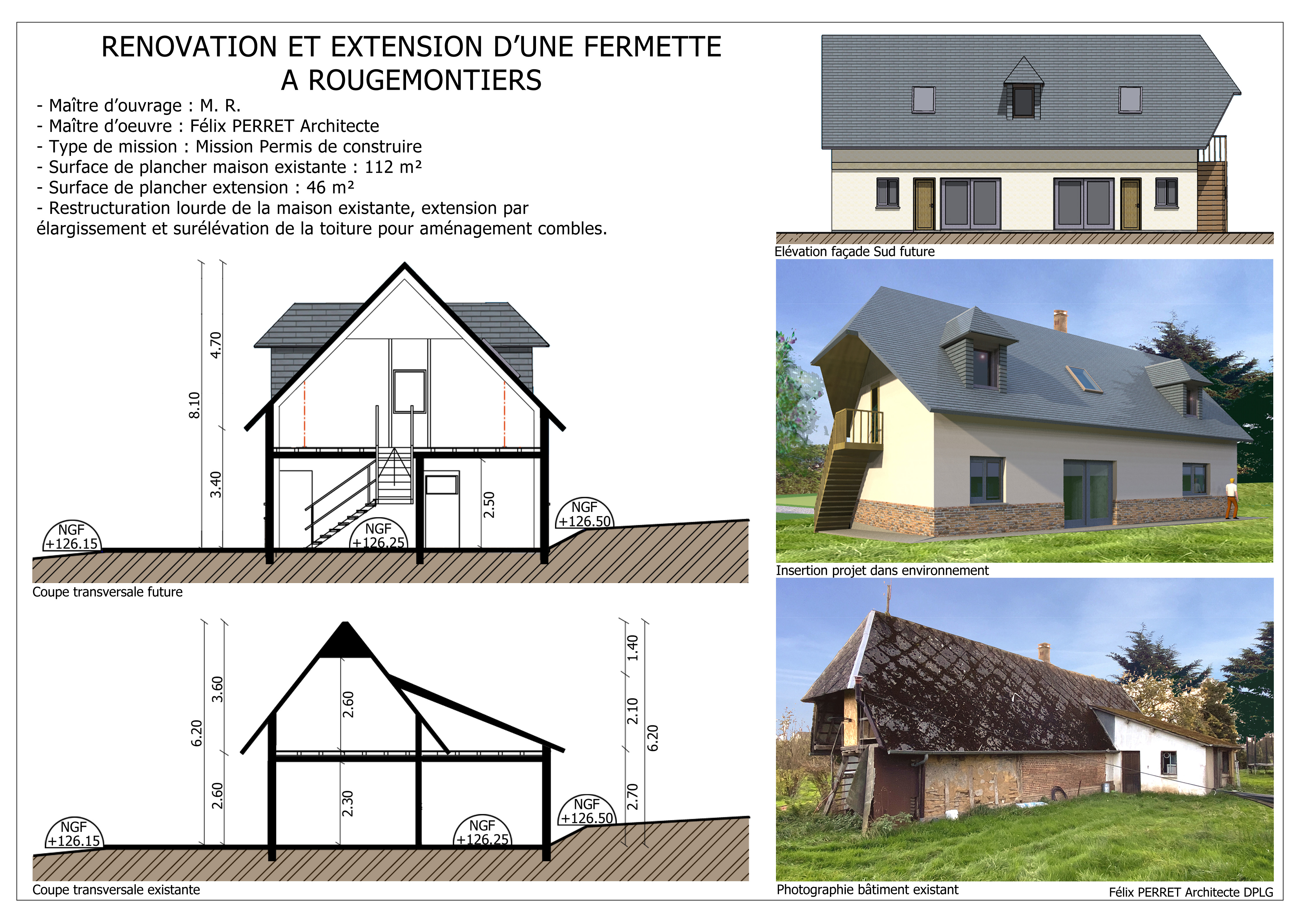 Maître d’ouvrage : M. R.Type de mission : Mission Permis de ConstruireSurface de plancher maison existante : 112 m²Surface de plancher extension : 46 m²Caractéristiques : Restructuration lourde de la maison existante, extension par élargissement et surélévation de la toiture pour aménagement combles.