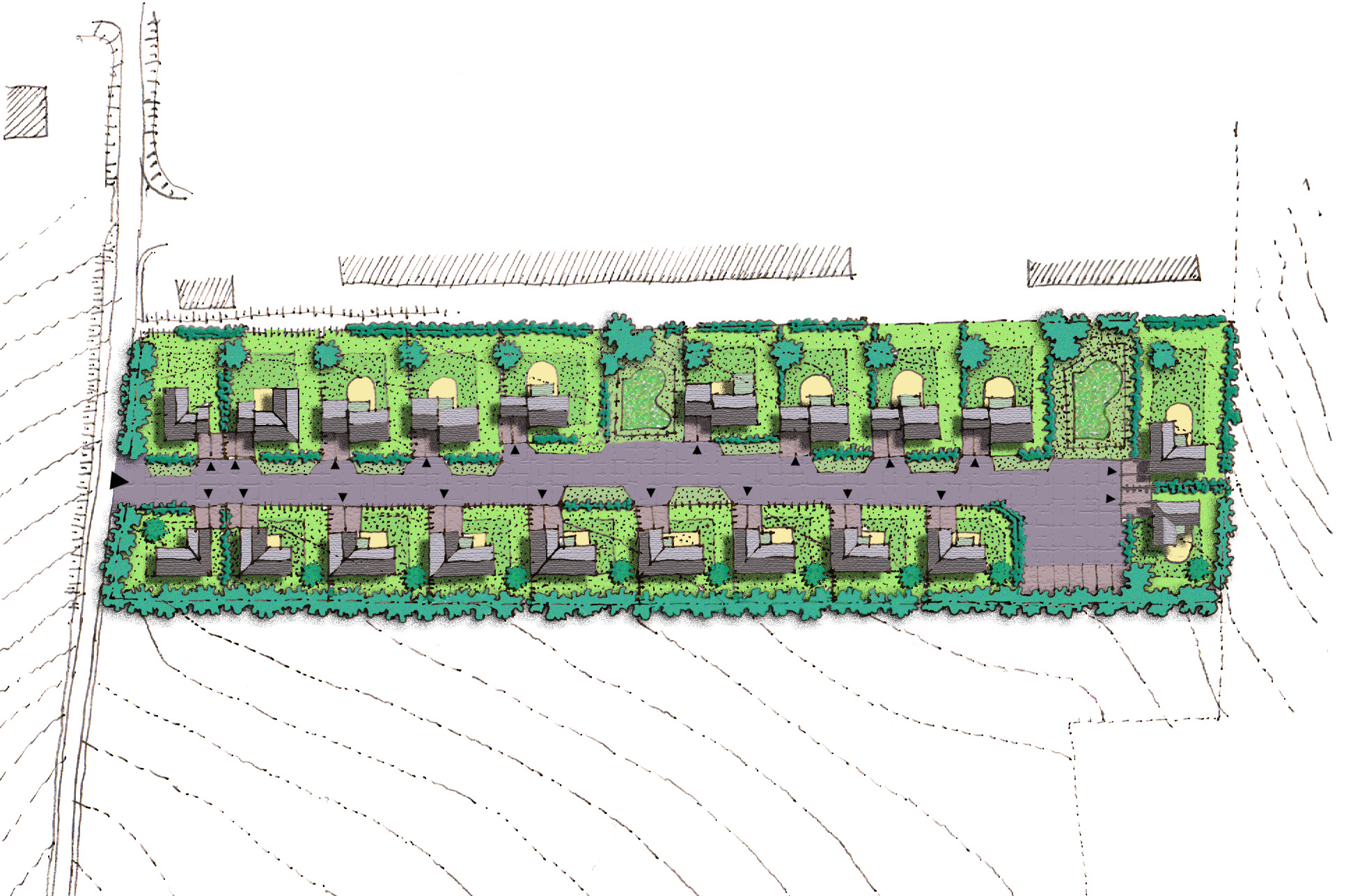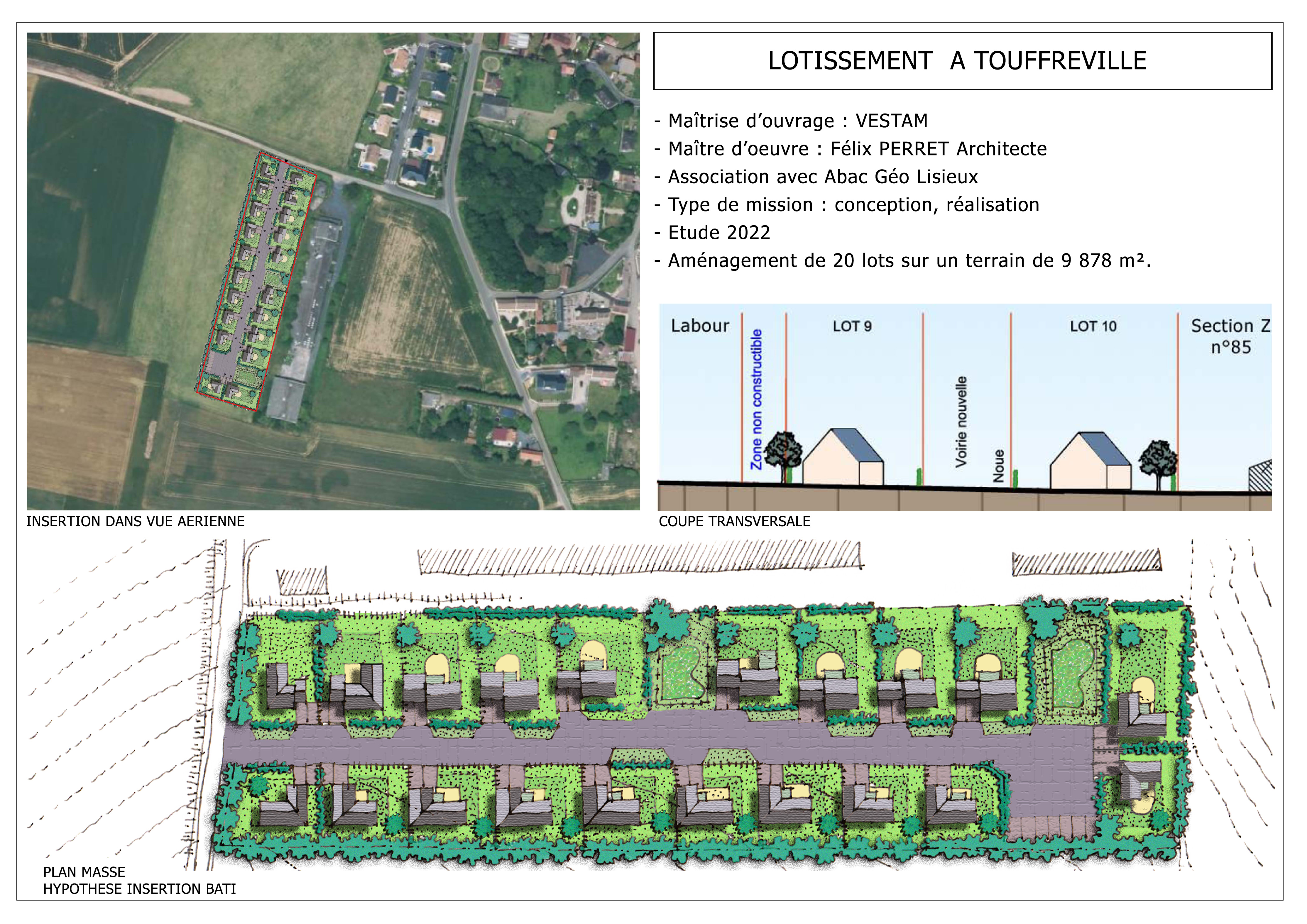 Maître d’ouvrage : VESTAMAssociation avec Abac Géo lisieuxType de mission : Conception, réalisationEtude en cours 2022Caractéristiques : Aménagement de 20 lots sur un terrain de 9878m²