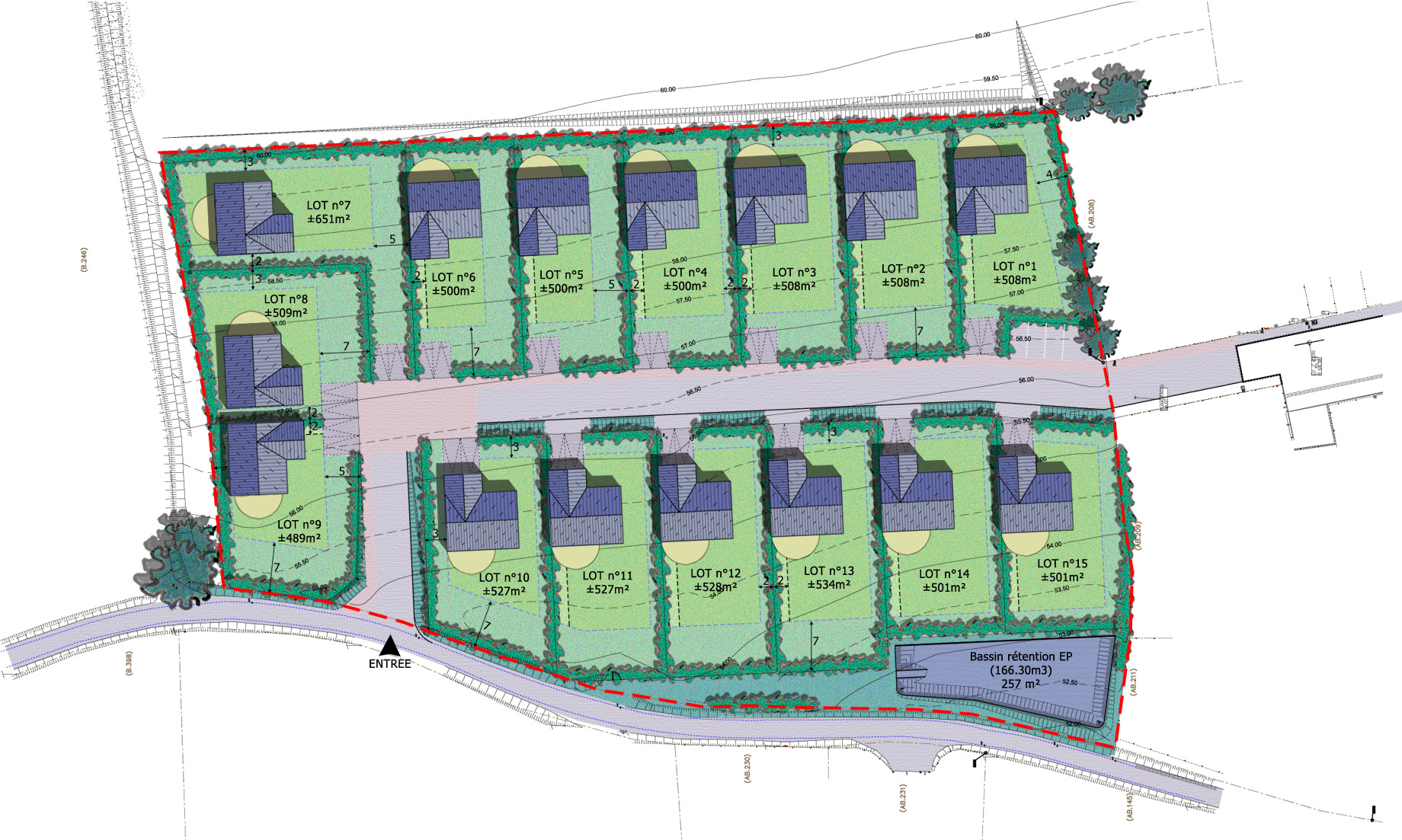 Maître d’ouvrage : SARL ZIG ZAG M. BROUARDAssociation avec AménagéoType de mission : Conception, réalisationEtude en cours 2022Caractéristiques : Division d’un terrain de 6537m² pour création de 15 parcelles d’une superficie comprise entre 489 et 651m²